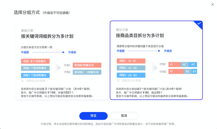 注意??:6月后,再升級為新版的關鍵詞推廣商家,系統(tǒng)將根據(jù)您歷史的分組信息,為您生成多個計劃,便于您進行精細管理;