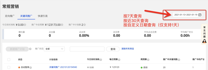 您可以通過現(xiàn)有計劃列表,篩選時間周期來查看近7天、30天、以及自定義近1天,查看對應數(shù)據(jù);