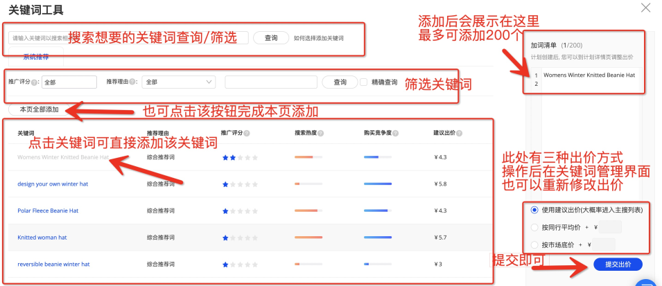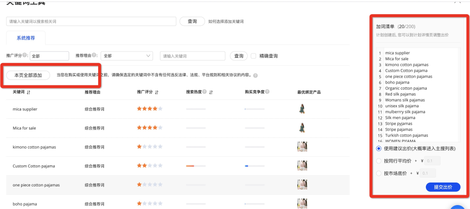 4、選詞、設置出價(這里設置出價后,您可以在計劃新建完成后,在詳情中完成單個詞的價格調(diào)整),設置完畢后,點擊【提交出價】