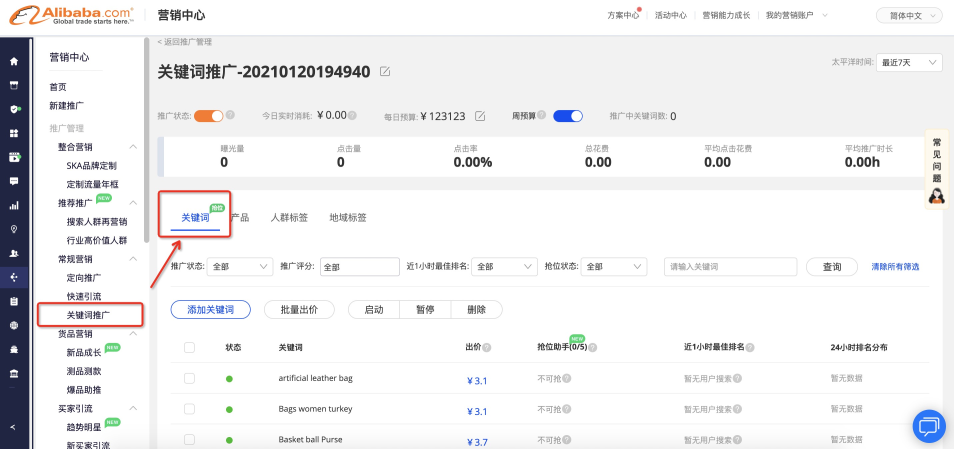 點擊計劃名稱,進入計劃詳情后,點擊【關鍵詞】,即可看到您之前在關鍵詞推廣計劃中的全部關鍵詞;您可以在該界面完成關鍵詞的管理,不支持單個關鍵詞與產(chǎn)品的綁定與關聯(lián);