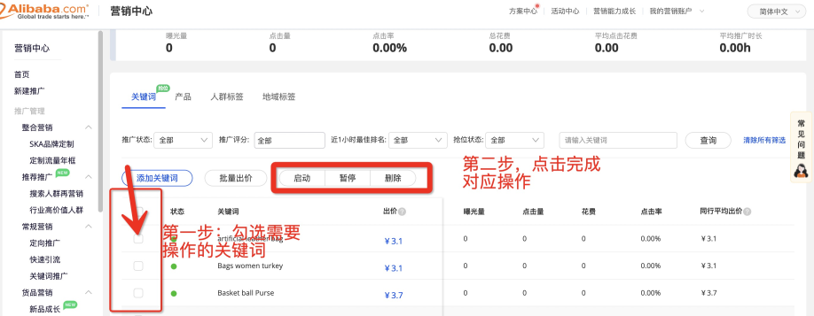 新版關鍵詞推廣中,詞、品、標簽等信息,可分開進行管理,具體操作模塊如下: