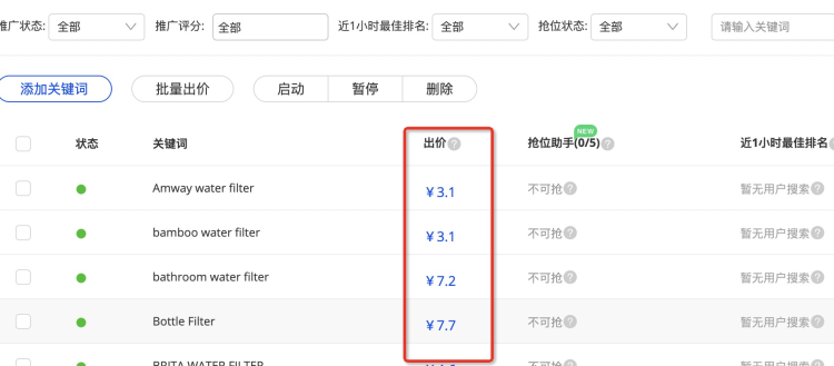 搶位助手溢價*該關鍵詞出價*人群/地域溢價(選擇溢價更高的標簽溢價)=實際最高出價