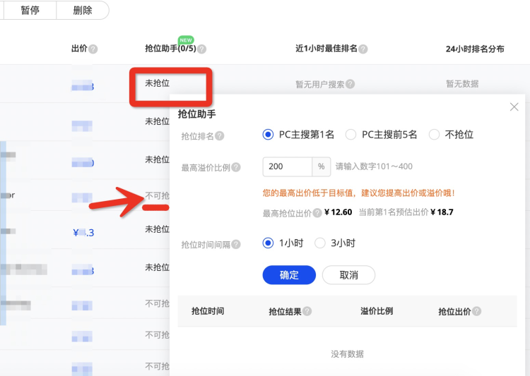 如您的關鍵詞推廣評分在3星以上,即可設置搶位,反之不可搶位;