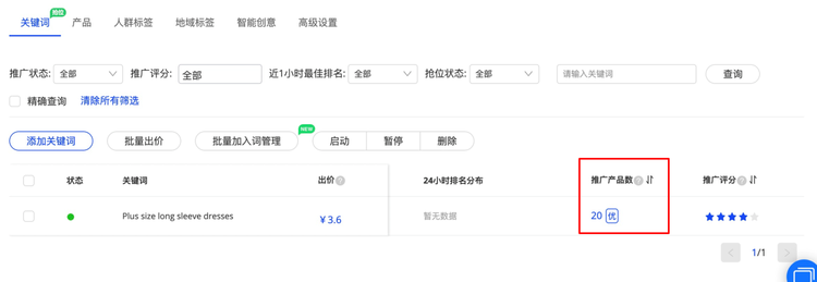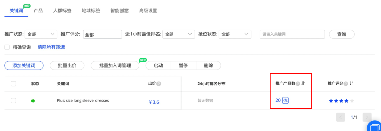 點擊【關鍵詞】下方,【推廣產(chǎn)品數(shù)】下方的數(shù)字,即可查看當前該關鍵詞所關聯(lián)的對應商品;
