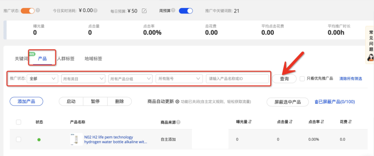 可根據(jù)當前商品的推廣狀態(tài)、當前商品的發(fā)布類目、您自身針對商品的分組、以及操作人員賬號、或輸入產(chǎn)品名稱或者商品ID,點擊查詢,即可完成計劃商品篩選;商品名稱輸入匹配不分大小寫;