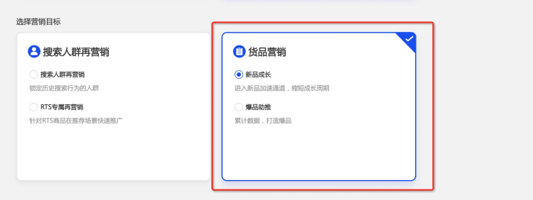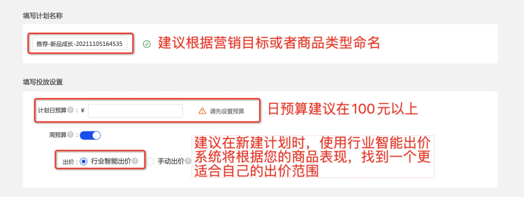 第二步-選擇貨品營銷->>新品成長,完成計劃名稱設置與預算設置;