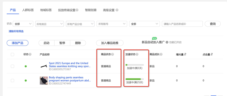 - 選擇優(yōu)先推廣新品(90天內新發(fā)布(非編輯),且在關鍵詞推廣內設置為優(yōu)先推廣的產(chǎn)品),可以快速篩選出想要主推的優(yōu)先推廣新品;