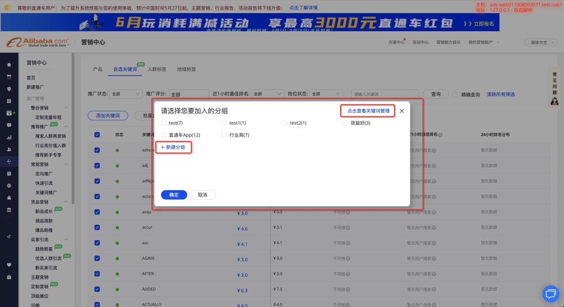選擇要加入的分組,或者直接新建分組,同時右上方可以點(diǎn)擊查看關(guān)鍵詞管理