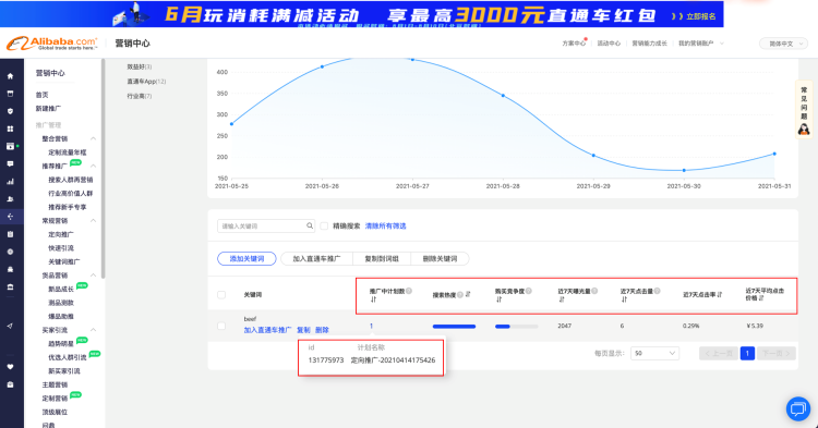 點(diǎn)擊推廣中計劃數(shù)列表下對應(yīng)的數(shù)字,會顯示該關(guān)鍵詞所處的計劃名稱和計劃ID