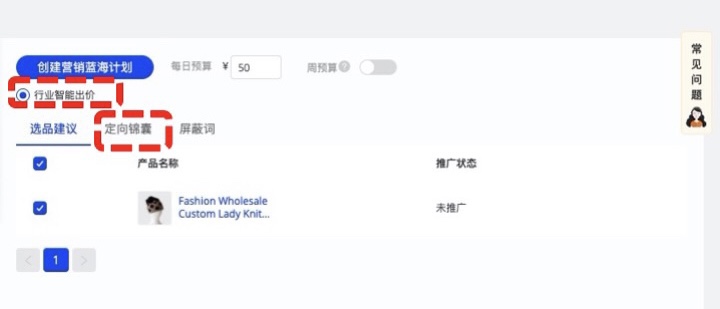 2. 定向錦囊:根據(jù)您選擇推廣的品中,推薦藍(lán)海指數(shù)最高的5個(gè)國(guó)家進(jìn)行推廣,自動(dòng)設(shè)置溢價(jià)。即可開(kāi)啟您的營(yíng)銷(xiāo)藍(lán)海榜計(jì)劃。