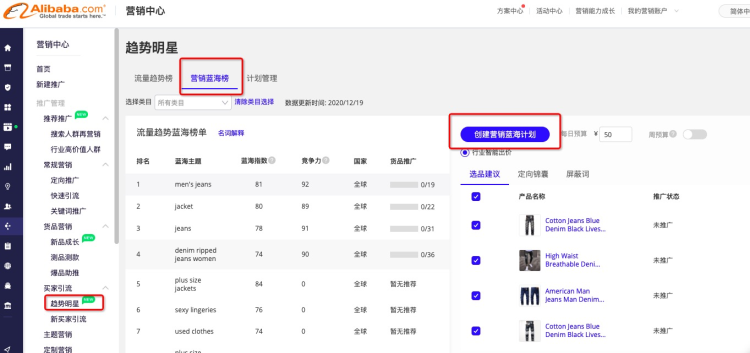 -您可以通過(guò)營(yíng)銷(xiāo)中心首頁(yè)左側(cè)導(dǎo)航欄:買(mǎi)家引流->>趨勢(shì)明星->>營(yíng)銷(xiāo)藍(lán)海榜->>開(kāi)啟計(jì)劃;