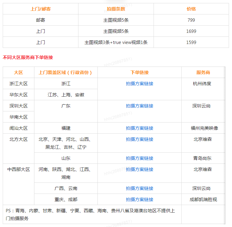 注:如客戶需要三方拍攝,外貿(mào)服務(wù)市場(chǎng)針對(duì)本次活動(dòng)給出專屬拍攝優(yōu)惠,協(xié)助發(fā)布優(yōu)質(zhì)視頻,服務(wù)商拍攝優(yōu)先審核,具體方案如下,各大區(qū)商家可以根據(jù)指定服務(wù)商進(jìn)行下單