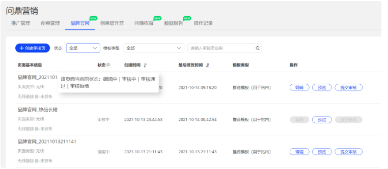 - 提交審核后,系統(tǒng)自動(dòng)跳轉(zhuǎn)到品牌官網(wǎng)的list頁(yè)面,這里面你可以查看制作官網(wǎng)目前的狀態(tài)。