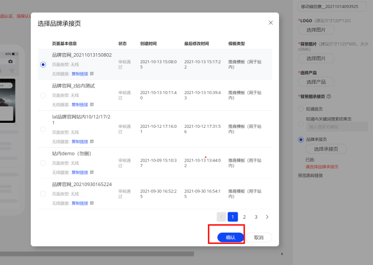 當(dāng)制作的頁(yè)面審核通過(guò)后,就可以開(kāi)始綁定創(chuàng)意投放了,在新建移動(dòng)創(chuàng)意時(shí),背景圖承接頁(yè)一項(xiàng),選擇“品牌承接頁(yè)”,在彈窗中選擇審核通過(guò)的,點(diǎn)擊確定即可