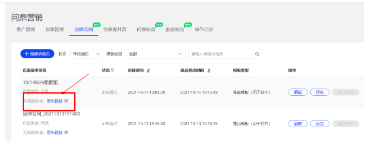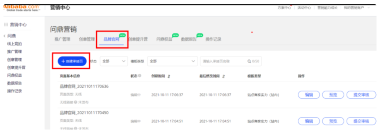 “營(yíng)銷(xiāo)中心-問(wèn)鼎后臺(tái)-品牌官網(wǎng)”點(diǎn)擊創(chuàng)建承接頁(yè),點(diǎn)擊推品模板“開(kāi)始制作”