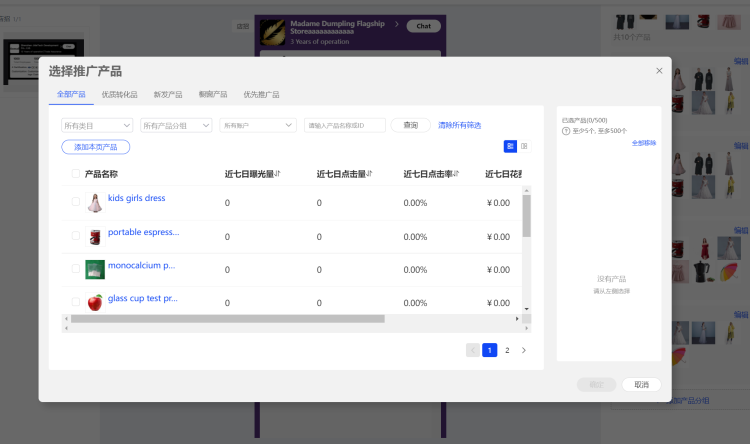 點(diǎn)擊右側(cè)“添加產(chǎn)品分組”,選擇添加需要站外投放的產(chǎn)品,至少50個(gè),最多500個(gè)。