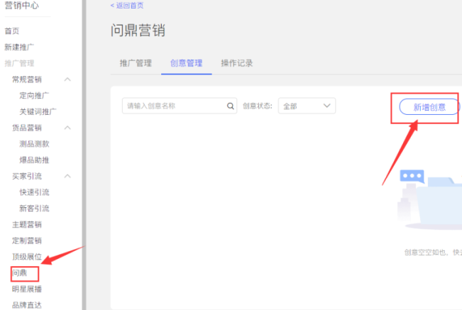 進(jìn)入直通車(chē)營(yíng)銷(xiāo)中心-右側(cè)導(dǎo)航選擇問(wèn)鼎-進(jìn)入問(wèn)鼎主頁(yè)-選擇創(chuàng)意管理-點(diǎn)擊新增創(chuàng)意