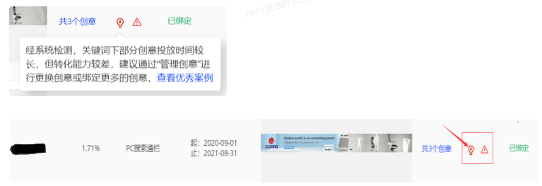 劃重點(diǎn):如下圖當(dāng)一個(gè)創(chuàng)意,投放大于15天,并且點(diǎn)擊率小于1%,系統(tǒng)會(huì)給出“紅色燈泡”提醒預(yù)警。